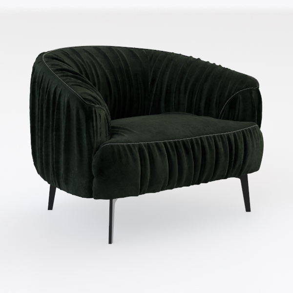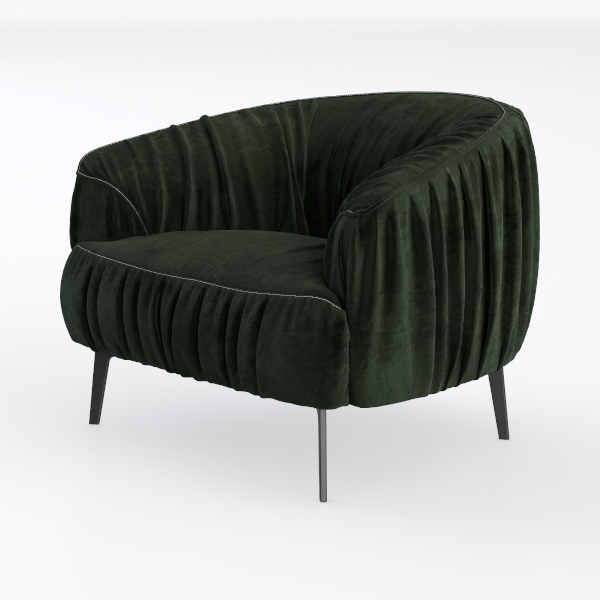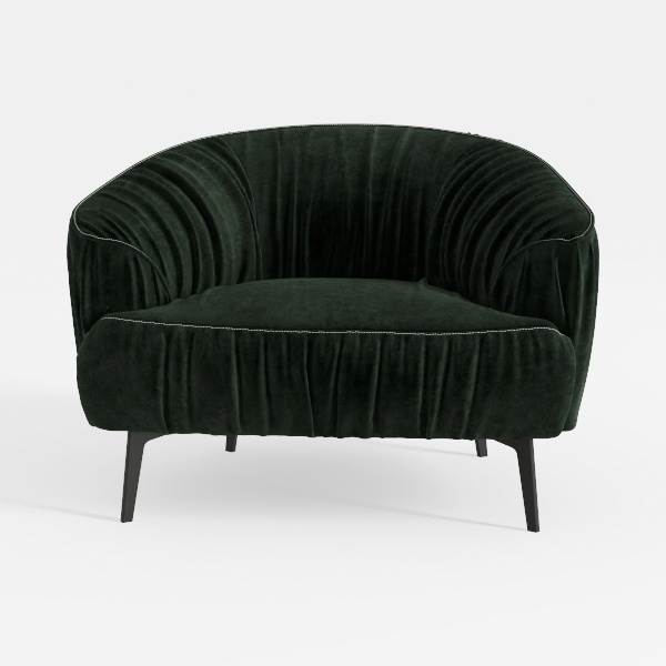 Drawing inspiration from mid-century modern artistry and soft, flowing silhouettes, this armchair marries nostalgic warmth with contemporary allure. Crafted with a lush velvet upholstery in a deep, verdant green, its surface shimmers softly under light, while the gentle, gathered folds along the curved back and seat add tactile and visual depth. The fabric feels sumptuously soft to the touch, inviting relaxation with its plush, wrap-around embrace that cradles the body.