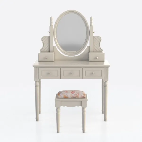 The warm off-white finish, achieved through smooth wood grains, radiates a gentle, inviting glow that softens any bedroom space. The oval mirror, framed by slim, tapering pillars, adds a rounded contrast to the structured lines of the frame, while its polished surface reflects light to brighten the area. The wooden surface feels cool yet comforting to the touch, with subtly carved side panels that introduce subtle texture without overwhelming the eye, and the small, round knobs on the drawers offer a tactile, user-friendly grip.