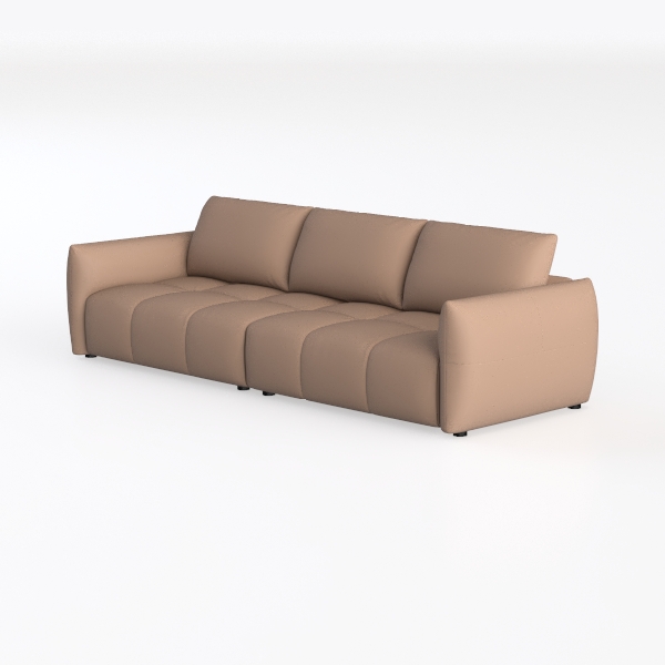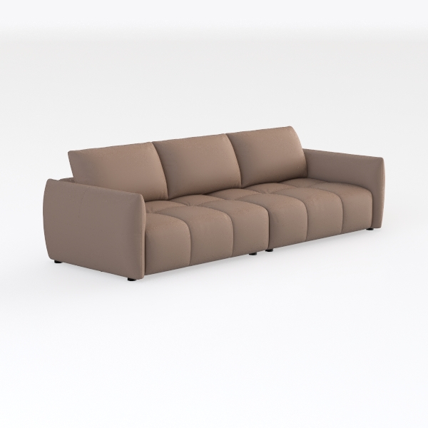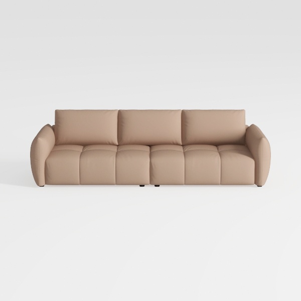 Crafted with mid-century modern elegance, this sofa draws inspiration from Scandinavian design principles, blending minimalist simplicity with timeless comfort. Its soft sand-colored upholstery features gently padded square modules, each stitched to create subtle texture, while curved armrests flow seamlessly into the low, wide silhouette, balancing structure and softness. The smooth, supple fabric feels luxurious to the touch—cool yet inviting, with a warm luster that reflects light beautifully, making the space feel airy and cozy.