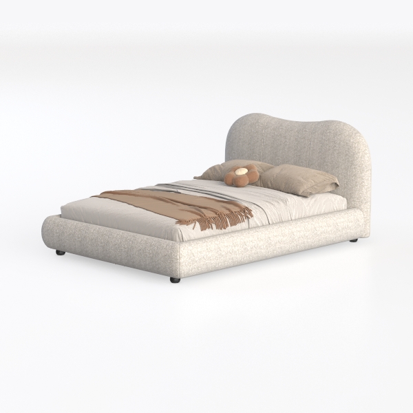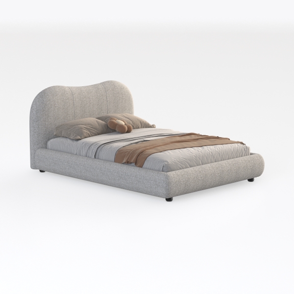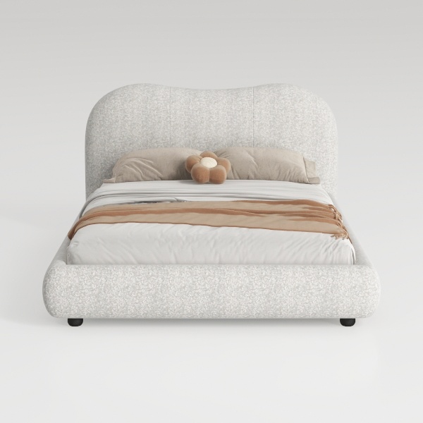 Inspired by soft, organic curves, this bed features a textured light gray upholstery that feels warm and inviting. Its generous, curved headboard offers excellent back support, ideal for minimalist or Scandinavian bedrooms. Pair with neutral-toned decor and soft linens to enhance a cozy, serene atmosphere, blending comfort and understated elegance.