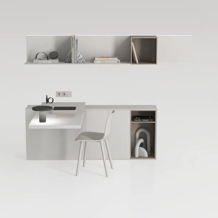 Inspired by the ethos of minimalism, this furniture collection embodies a harmonious blend of clean lines and organic softness, prioritizing functionality while maintaining an elegant, uncluttered aesthetic. Crafted with smooth, matte surfaces—from the sleek desktop to the gently curved chair back—the pieces offer a tactile warmth that contrasts beautifully with their minimalist form. The pure white and light gray palette creates an airy, open atmosphere, making the space feel expansive and serene, with subtle shadows adding depth to the understated design.