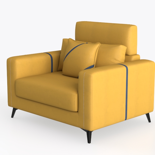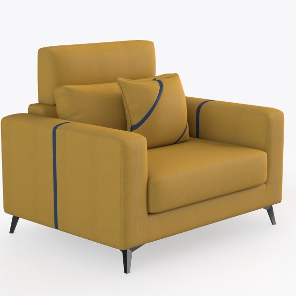 This armchair draws inspiration from the warm, sunlit glow of golden-hour light, merging rich, buttery yellow tones with streamlined, geometric silhouettes to infuse spaces with a lively yet polished charm. Its soft, textured upholstery feels surprisingly plush to the touch, with a smooth, velvety surface that invites relaxation, while the subtle topstitching along the armrests and seat edges adds understated detail, elevating its modern design.