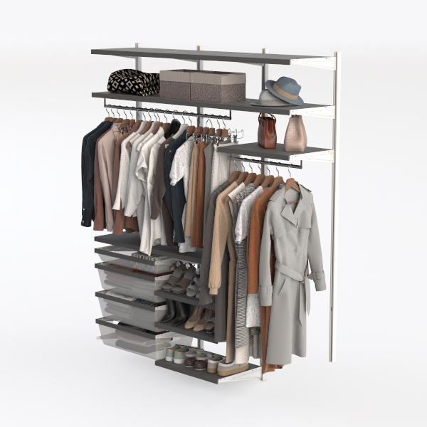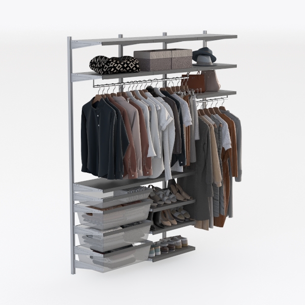 Design inspiration draws from minimalist organization, blending functionality with clean aesthetics. Crafted with sleek metal frames and smooth surfaces, it feels sturdy yet light; transparent drawers and varied clothing hues create a balanced, clutter-free look. Ideal for modern minimalist bedrooms, pairing beautifully with wooden floors and soft lighting, enhancing daily order. Ample hanging space, deep drawers, and a shoe rack below ensure efficient storage, practical and stylish.