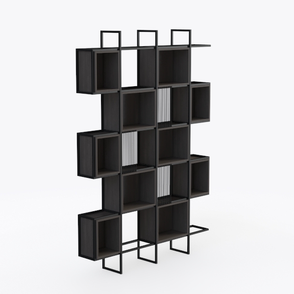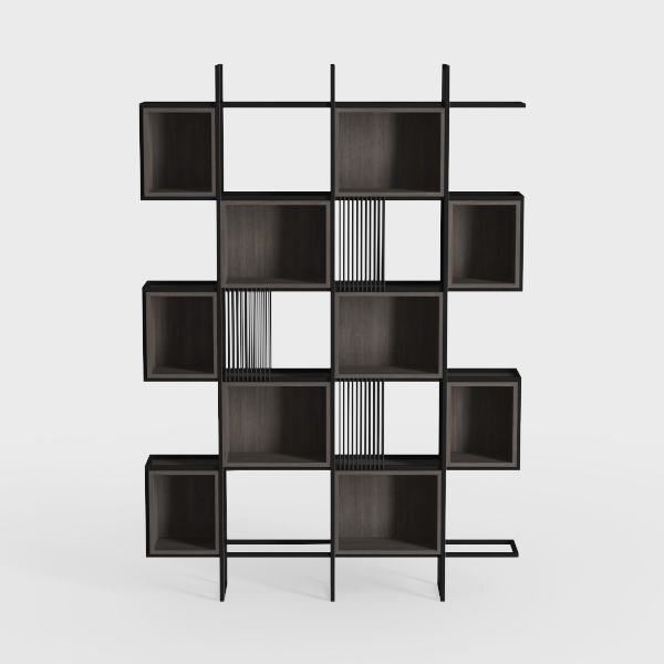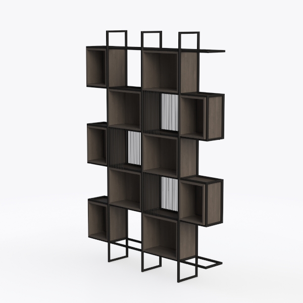Designed with geometric precision, this shelving unit blends warm dark wood tones with sleek black metal lines, evoking minimalist Scandinavian charm. The smooth wood surface offers a tactile contrast to the cool metal frame, creating visual balance and depth. Ideal for modern living rooms or home offices, it pairs beautifully with neutral sofas and potted plants, with multiple staggered compartments providing flexible storage for books, decor, or collectibles, keeping spaces organized yet uncluttered.