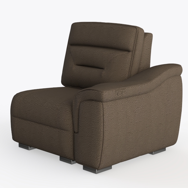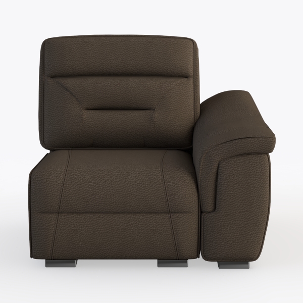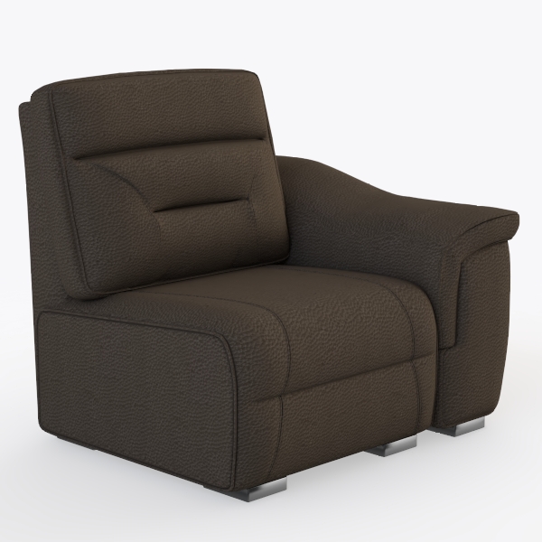 The deep brown upholstery, with a subtle, textured surface resembling high-quality faux leather, feels smooth yet tactile. Light catches its fine grain, creating understated depth, while the neutral tone grounds any space. Sleek metal legs, finished in a muted gunmetal, elevate the piece slightly, keeping the base airy and easy to clean beneath.