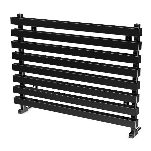 A modern black radiator featuring a sleek horizontal panel design with 500000 polygons, ideal for contemporary bathrooms and interior spaces.