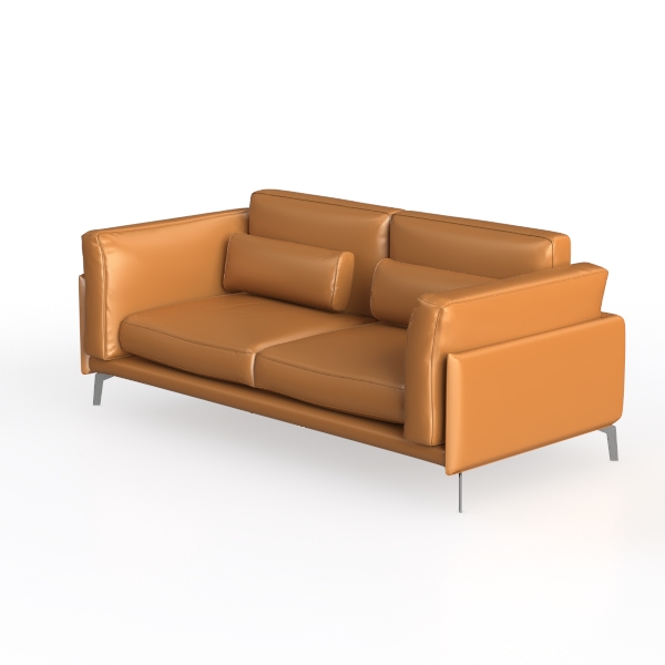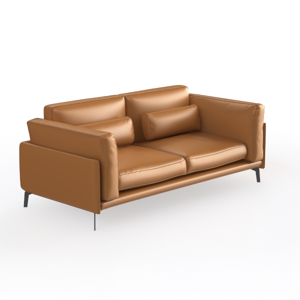 The star of the piece is its upholstery: a rich, buttery caramel leather that feels surprisingly soft to the touch, with a subtle, luminous sheen that catches light gently, avoiding harsh glare. The leather’s warm, earthy tone exudes coziness, while the clean lines of the frame—sleek, unadorned, and slightly tapered—create a sense of calm, making the sofa feel both substantial and airy. The integrated armrests, contoured to cradle the arms, add to the comfort, while the matte black metal legs, thin yet sturdy, provide a grounded base that elevates the piece without weighing it down.