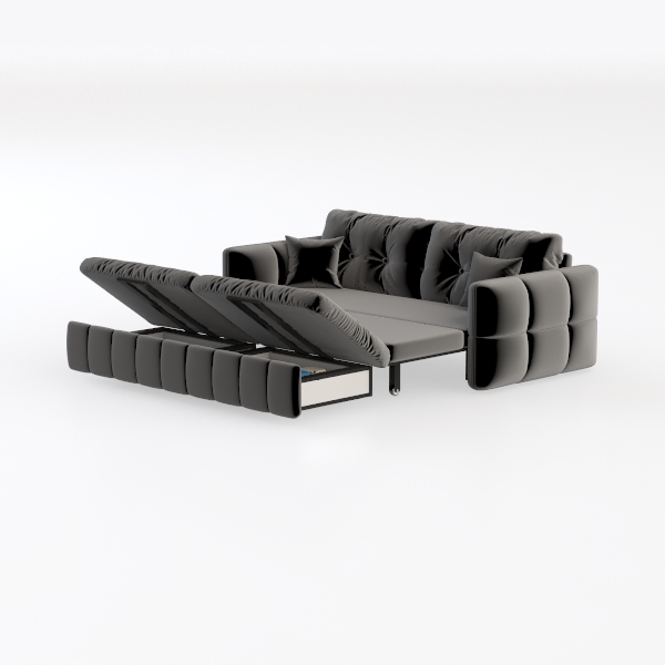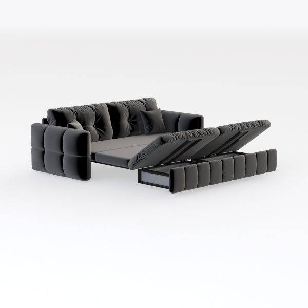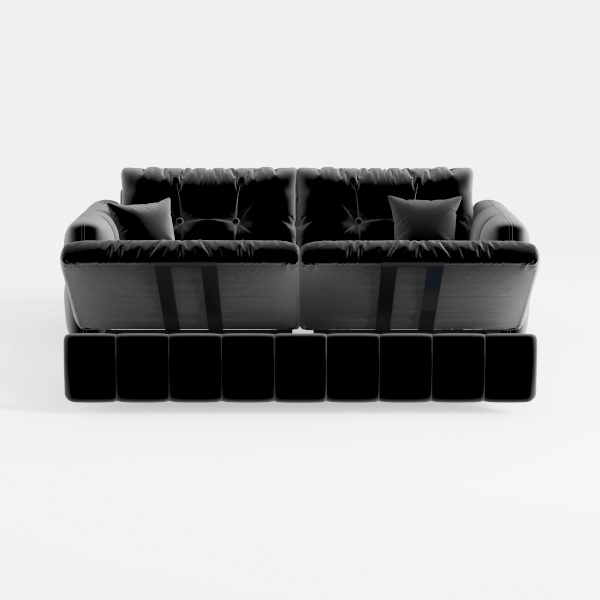 This elegant sofa draws inspiration from the harmonious blend of mid-century modern minimalism and contemporary luxury, balancing softness with structured sophistication. Its most striking feature is the sumptuously soft velvet fabric, which feels like a gentle embrace—plush yet not overly heavy, with a subtle sheen that catches light softly, adding depth to its sleek black hue. The design is defined by clean lines: deep, button-tufted backrests cradle the shoulders, while generously sized armrests invite relaxed resting, creating a sense of both grandeur and coziness. The block-like base, with its uniform, geometric profile, grounds the piece, offering a modern contrast to the sofa’s rounded edges and plush upholstery.