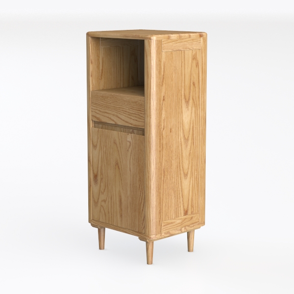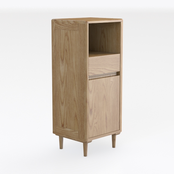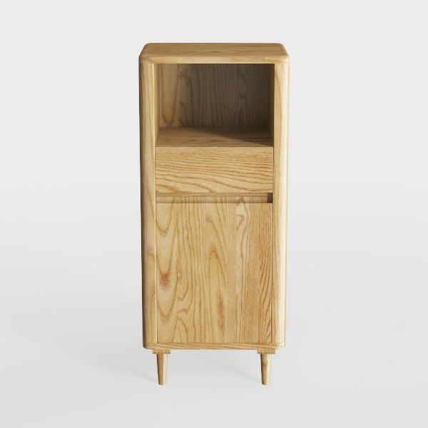 Inspired by natural wood textures, this cabinet features smooth, warm oak grain with clean lines and light wood tone. Its open shelf holds decor, while the drawer offers hidden storage. Ideal for modern minimal or Scandinavian-style spaces, pairing with soft textiles and sleek furniture, with slim legs enhancing a lightweight, functional charm.