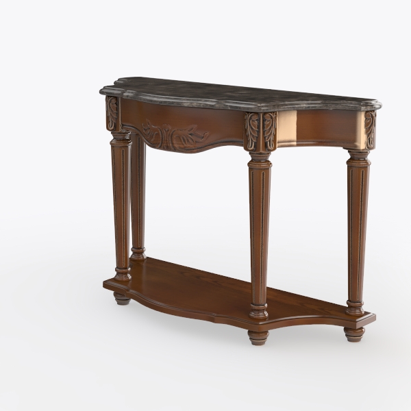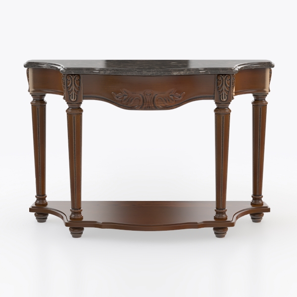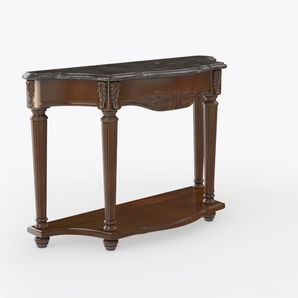 Inspired by classic European craftsmanship, this elegant console table features warm, polished wood with intricate carvings and a sleek marble top, blending soft warmth and cool elegance. Perfect for a grand foyer or living room, it complements neoclassical or French provincial styles, especially with brass floor lamps and potted greenery. The lower shelf adds practical storage for decor, while sturdy legs ensure stability, making it both functional and a decorative highlight.