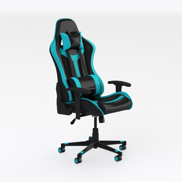 Inspired by racing seats, blending performance and dynamic style. Sleek black-cyan lines, smooth fabric texture, sturdy frame. Ideal for modern gaming setups, pairs with RGB lighting and gear. Wide seat depth, adjustable height, lumbar support, smooth-rolling casters for all-day comfort.