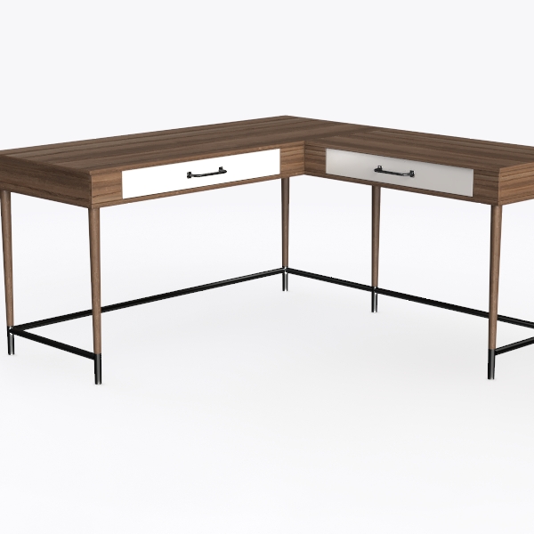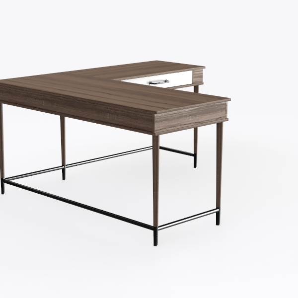 Inspired by the blend of natural wood warmth and sleek industrial minimalism, this piece features a smooth, grained wooden top contrasting with matte black metal legs, creating a balanced tactile and visual appeal. Ideal for a modern minimalist home office or cozy living nook, it pairs beautifully with soft textiles and potted greenery. The L-shaped design maximizes workspace, while a hidden drawer adds practical storage, merging style and functionality seamlessly.