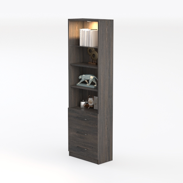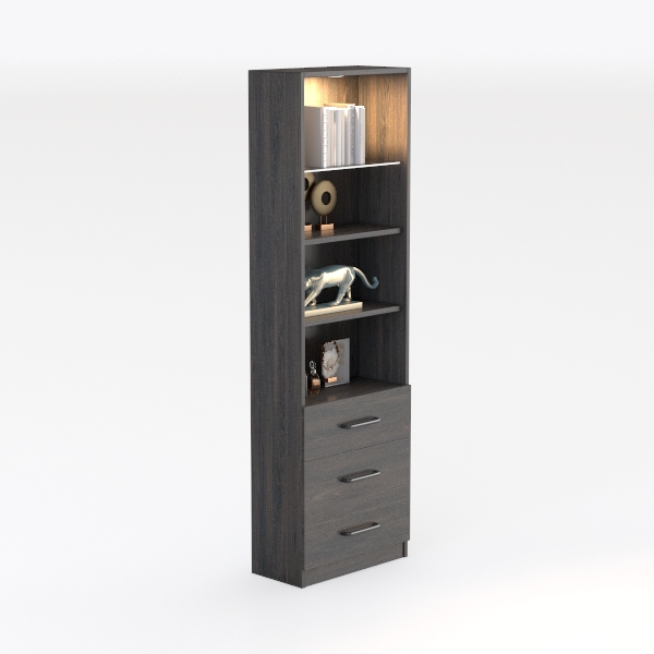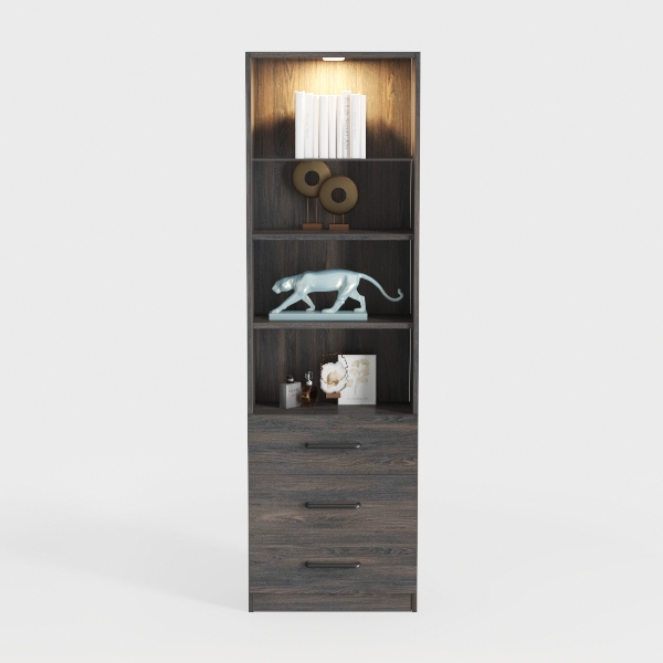Blending contemporary minimalism with organic warmth, this tall storage unit features warm wood grain textures and soft built-in lighting, creating a cozy yet sleek look. Layered shelves display curated decor like books and art, while three smooth drawers offer ample storage. Ideal for modern living rooms or home offices, pairing seamlessly with minimalist sofas and marble accents, balancing functionality with elegant style.