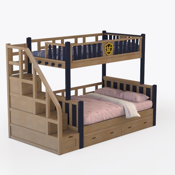 This bunk bed draws inspiration from family coziness and space efficiency, boasting warm wooden tones with sleek dark accents. Its smooth surfaces and sturdy frame offer a tactile blend of comfort and durability, ideal for a kid’s room. Pair it with soft pastels and playful decor for a Scandinavian-inspired, clutter-free space, with under-bed drawers and staircase storage enhancing functionality.