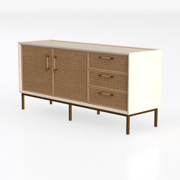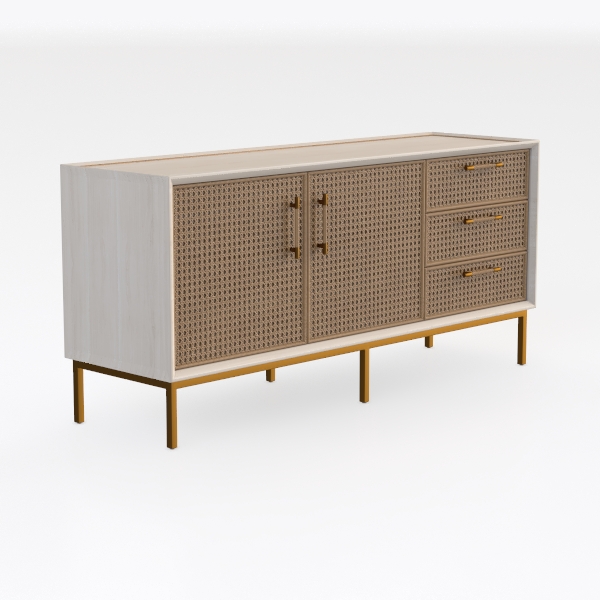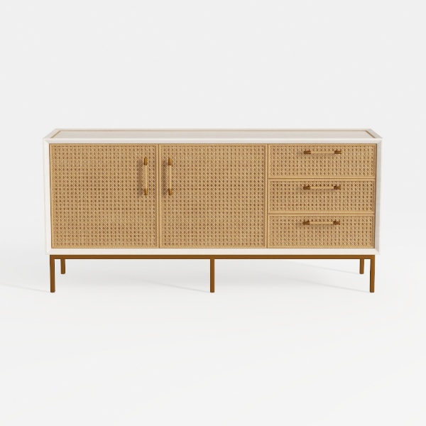 Drawing inspiration from natural weaving, this sideboard blends organic warmth with modern flair. Its textured rattan surface offers a tactile, earthy feel, while the crisp white top and gold metal legs add sleek contrast. The interplay of natural texture and clean lines creates a balanced, inviting look. Ideal for coastal, bohemian, or minimalist spaces, it pairs beautifully with wooden floors and marble accents. With drawers and cabinets for storage, it keeps spaces tidy, its slender legs ensuring a light, unobtrusive presence.