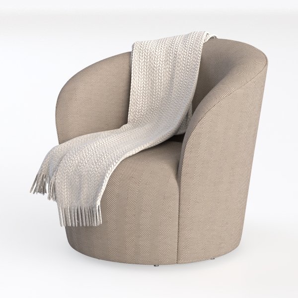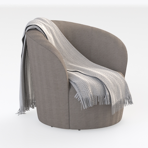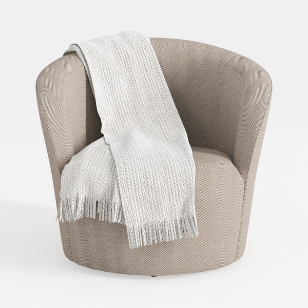 Visually, the chair exudes warmth and softness. The upholstery features a delicate herringbone pattern in a muted taupe shade, its texture resembling a soft, woven wool that catches light gently—neither overly bold nor stark, it feels like a quiet nod to natural materials. A plush, knit throw with fine tassels draped casually over one arm adds an extra layer of coziness, its creamy white hue complementing the chair’s neutral base and enhancing the overall sense of calm.