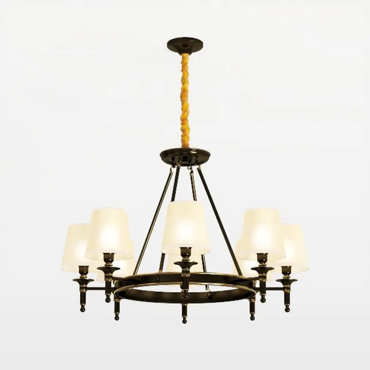 A 3D model of a chandelier, featuring multiple golden circular rings and metallic material, with a modern minimalist aesthetic. It has a low-poly design and is suitable for home decoration, especially living rooms.