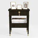 Inspired by classic furniture lines, blending timeless elegance with modern minimalism, this side table features dark wood with subtle grain. Gold metal accents—from the drawer pull to tapered legs—add crisp contrast, creating a warm, layered visual texture. Ideal for modern-luxe living rooms or bedrooms, it pairs beautifully with marble coffee tables and brass floor lamps, enhancing space sophistication. The lower shelf neatly holds magazines, and the functional drawer with a gold pull offers hidden storage for remotes or reading glasses, balancing style and utility.