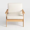 Crafted with understated elegance, this armchair takes cues from Scandinavian design principles, emphasizing simplicity, functionality, and harmony with natural elements. Its seat and backrest feature a soft, textured beige upholstery that invites gentle touches, while the light oak wooden frame adds warmth—its smooth, sanded surface enhancing the chair’s tactile appeal. The minimalist silhouette, defined by straight, unadorned lines and a neutral color palette, feels light and airy, creating a calm, uncluttered presence that complements diverse decor.