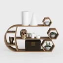 Crafted with geometric precision, this wooden shelving unit blends warm wood grains and crisp modernity. A striking gold skull adds edgy character, while hexagonal niches and open shelves provide versatile storage for decor, plants, and keepsakes. Ideal for modern or eclectic living rooms, it balances organic texture with contemporary flair.