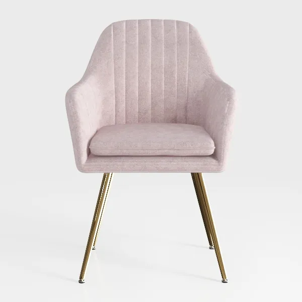Elegant lines inspired by mid-century modern design, this chair features soft, smooth upholstery with subtle vertical quilting for texture. Warm gold legs add luxury, while the contoured back and sturdy frame ensure comfortable seating. Ideal for a contemporary dining room or living area, pairing beautifully with marble tables and metallic accents.