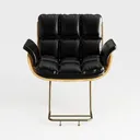Crafted with mid-century modern elegance, this armchair blends soft black leather with warm wooden armrests and sleek gold metal legs. The quilted leather surface offers a smooth, plush touch, while the polished gold frame adds a luxurious sheen, balancing cool metal and warm wood. Perfect for a contemporary living room or home office, it pairs beautifully with marble coffee tables and brass floor lamps. A sturdy silver gas lift ensures easy height adjustment, making it both stylish and practical for daily use.