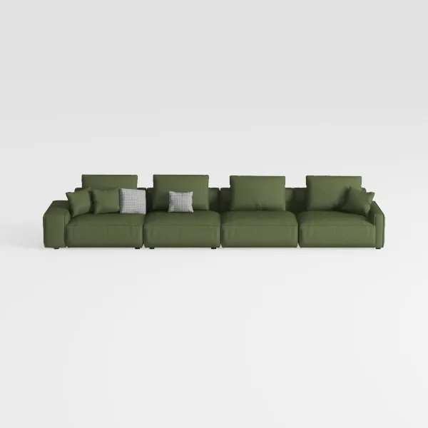 This olive-green modular sofa embodies a harmonious blend of natural inspiration and modern minimalism. Its design draws from the organic flow of forest canopies and the uncluttered elegance of Scandinavian aesthetics, balancing soft curves with sharp, structured edges to create a piece that feels both grounded and airy.