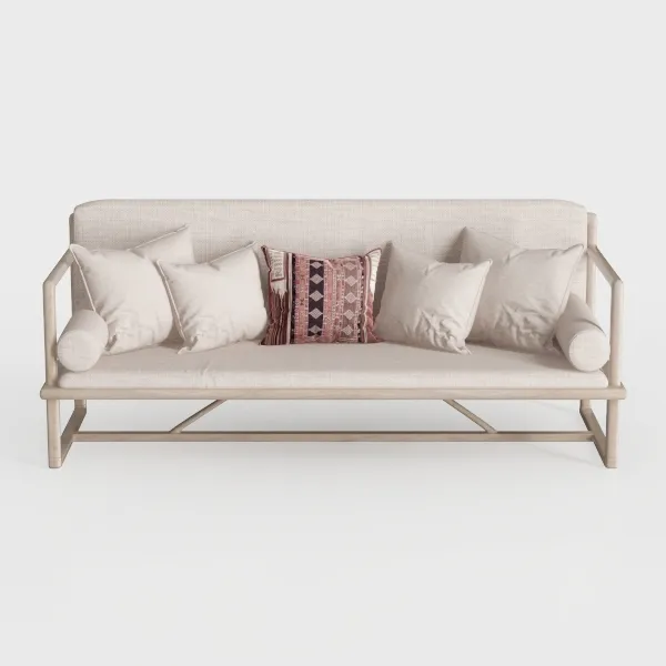 The sofa’s upholstery, a soft, textured fabric in a warm ivory tone, invites gentle touches—its fibers feel smooth yet slightly breathable, like a well-loved linen that softens with use. The slim, light-toned wooden frame, with its natural grain and subtly curved armrests, adds a tactile contrast, while the low, wide profile creates an open, approachable presence. Visually, it exudes understated elegance: the neutral palette allows it to blend seamlessly with diverse decor, while its soft silhouette softens the sharpness of more angular furniture, making it feel both intentional and effortless.