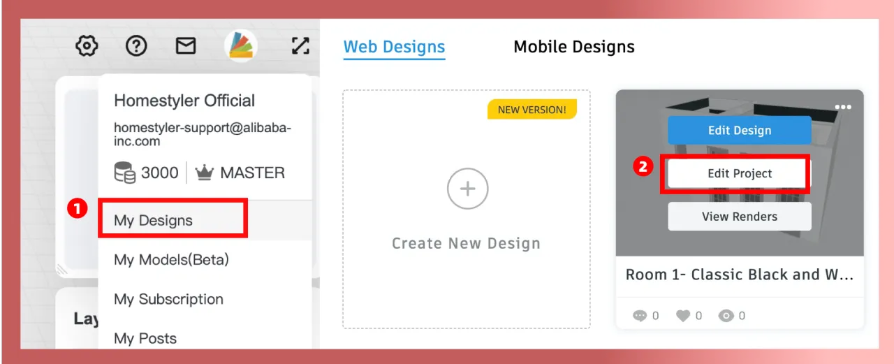 a)Please use Homestyler Floor Planner to create the design and renders that meet the requirements of the contest. After finishing the design, please go to "Edit Project" under the "My Designs" tab.