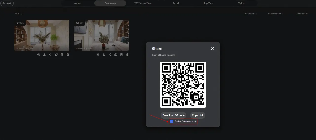 2)Tick the "Enable Comments" option at the bottom of the share window, then you can share the QR code or link to others for comment, and you can also comment on the panorama yourself.