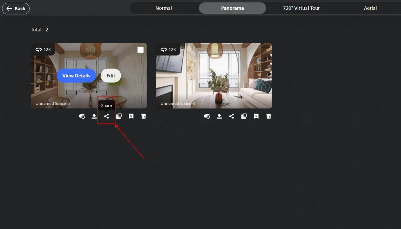 1)Open the rendered Panorama or 720° Virtual Tour in the album and click the 'Share' option.