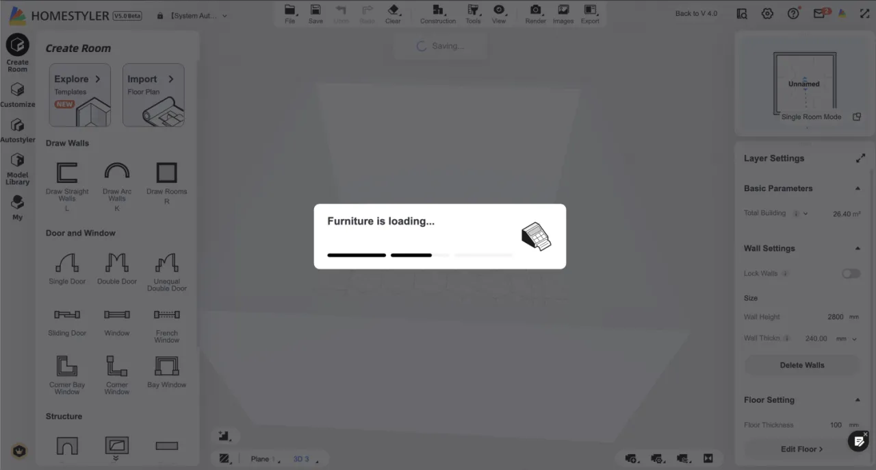 Homestyler V5.0 retains the original functions of V4.0, and on the basis of V4.0, it upgrades and optimizes the drawing of floor plans, importing cad files, and interior modeling. At the same time, it also adds new construction drawings, and parameterized doors & windows models, making it easier for you to complete the design professionally.