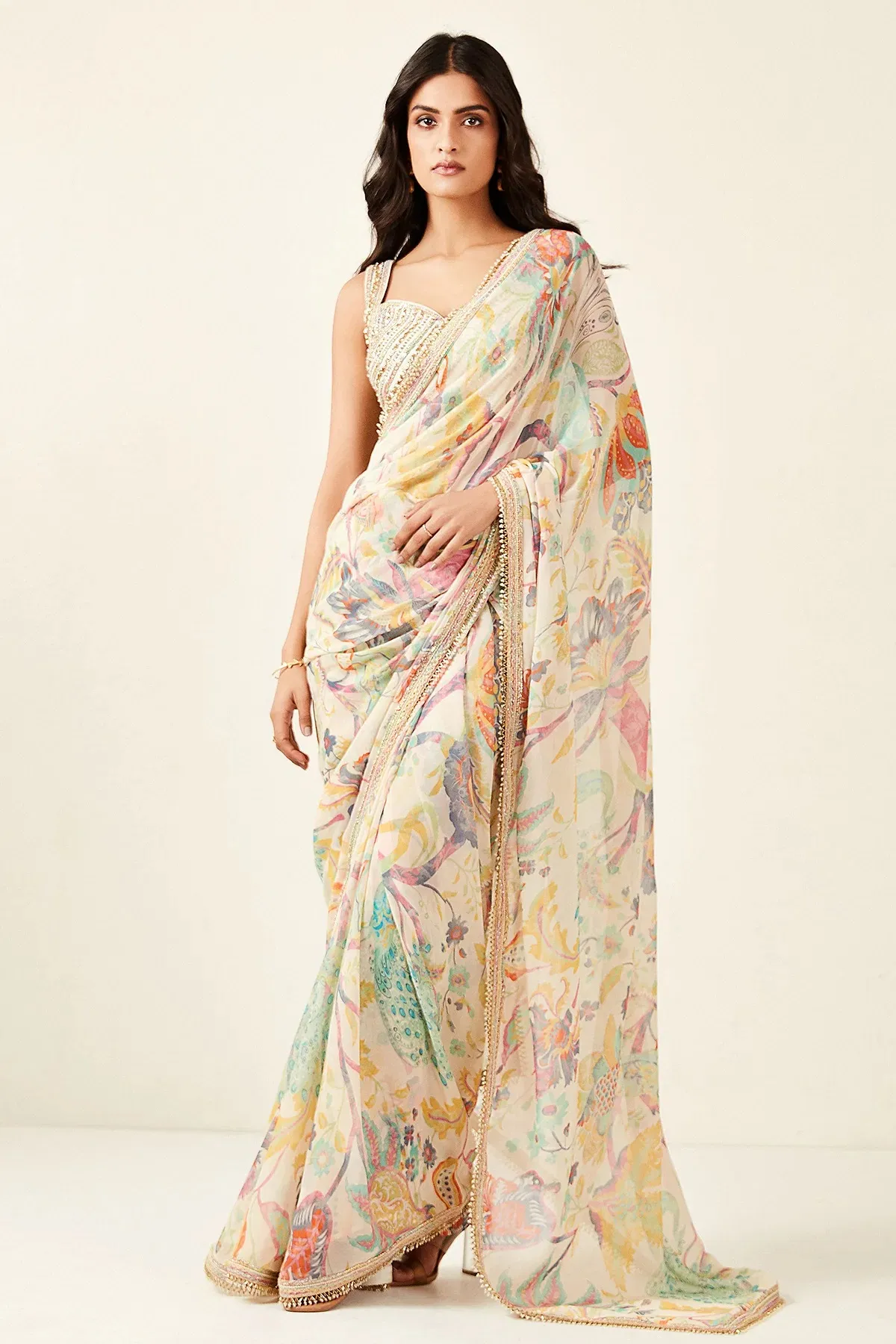 Channel breezy summer vibes with an Off-White Printed Georgette Saree. The off-white color exudes a sense of calmness and purity, while the georgette fabric ensures breathability during the hot weather. The printed design adds a touch of personality, making this saree perfect for both casual and semi-formal occasions. Accessorize with delicate jewelry and sandals for a complete summer look.