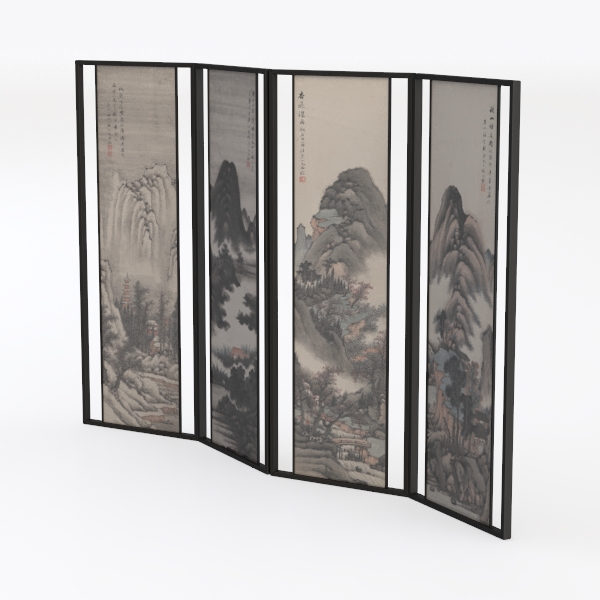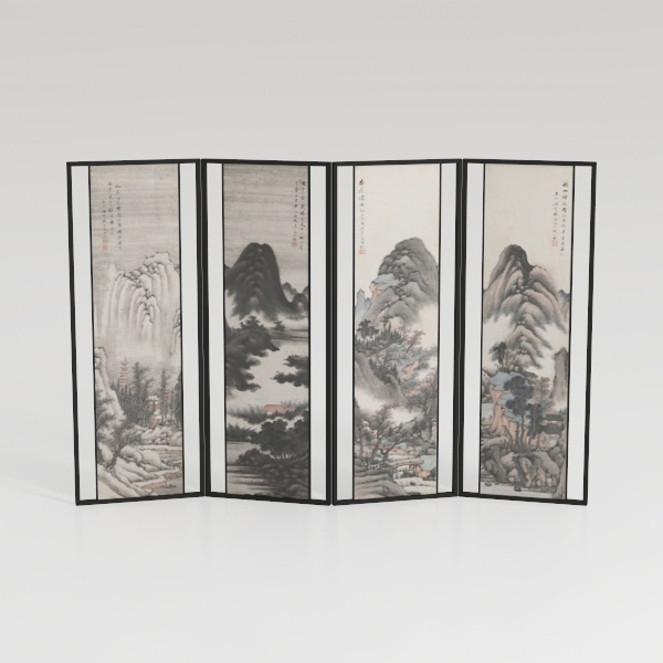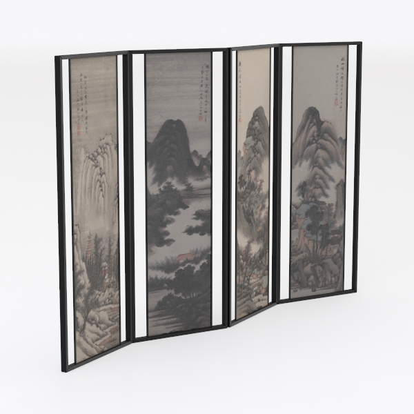 This elegant room divider draws inspiration from classical Chinese landscape scrolls, capturing the essence of nature’s quiet grandeur. Each panel features delicate ink-and-wash paintings, with soft tones of charcoal, misty grays, and subtle earthy hues that evoke rolling mountains, mist-cloaked valleys, and hidden pavilions. The composition flows seamlessly across the four sections, creating a continuous narrative of tranquility, as if inviting viewers into a timeless scene of rivers, forests, and distant peaks.