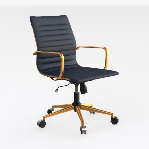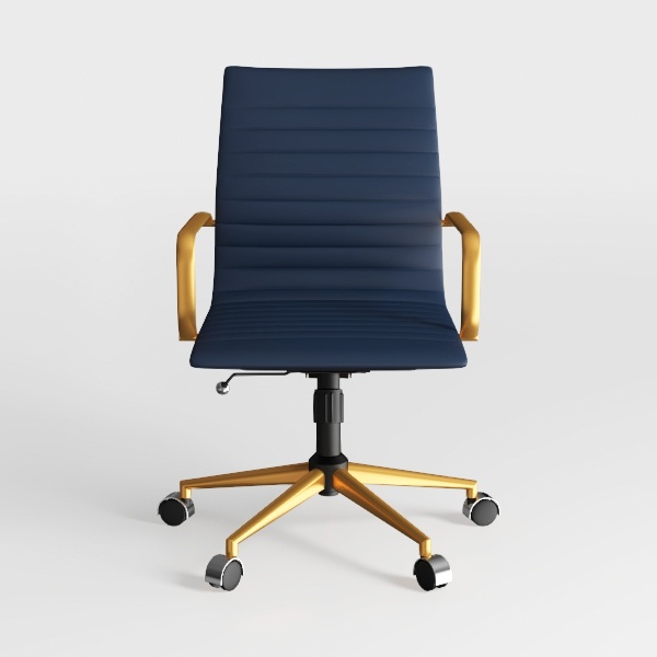 This chair draws design inspiration from the harmonious blend of industrial robustness and modern-day comfort, where geometric precision meets soft, inviting textures. The deep navy upholstery, with subtle vertical channeling, feels surprisingly supple to the touch—crafted from a premium microfiber material that balances firm support with gentle give, making it ideal for extended sitting. The golden metal armrests, curved to cradle the arms, and the five-point base, with its sleek, polished finish, add a touch of understated luxury; their warm metallic sheen contrasts beautifully with the rich blue, creating a focal point that feels both sophisticated and approachable. Visually, the high backrest, tapering to a streamlined top, and the clean lines of the frame give the piece a minimalist yet intentional presence, while the black gas-lift adjustment lever at the base adds a practical, unobtrusive detail.