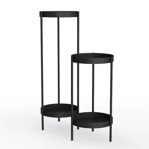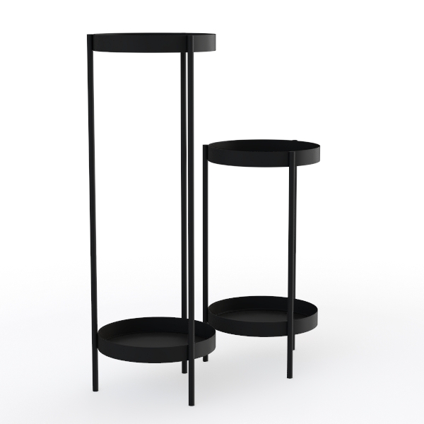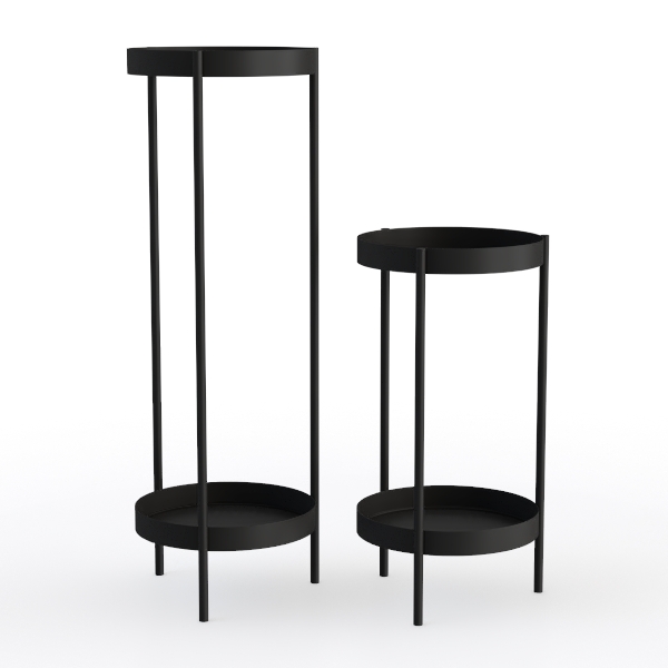The matte black metal finish features a subtle, velvety texture—smooth to the touch yet with a cool, industrial undertone, avoiding harsh reflections while maintaining a sleek, monochromatic allure. Their circular tiers, stacked vertically with slender, tapering legs, create a light, airy silhouette, ensuring they don’t overwhelm small spaces while adding vertical dimension.