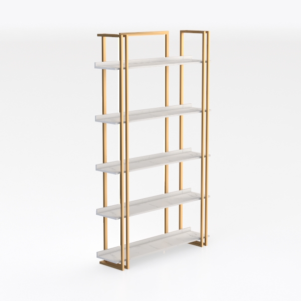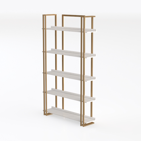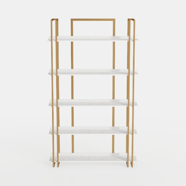 Crafted with a focus on geometric minimalism, this shelving unit draws inspiration from architectural precision, where clean lines and balanced proportions converge to create a piece that feels both intentional and serene. The frame, rendered in a warm, brushed brass tone, exudes a subtle metallic glow that softens under light, while the white marble-effect shelves offer a smooth, cool contrast—their glossy surface reflecting light gently, enhancing the unit’s airy, uncluttered presence.