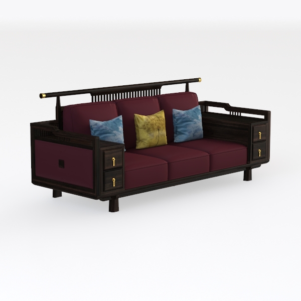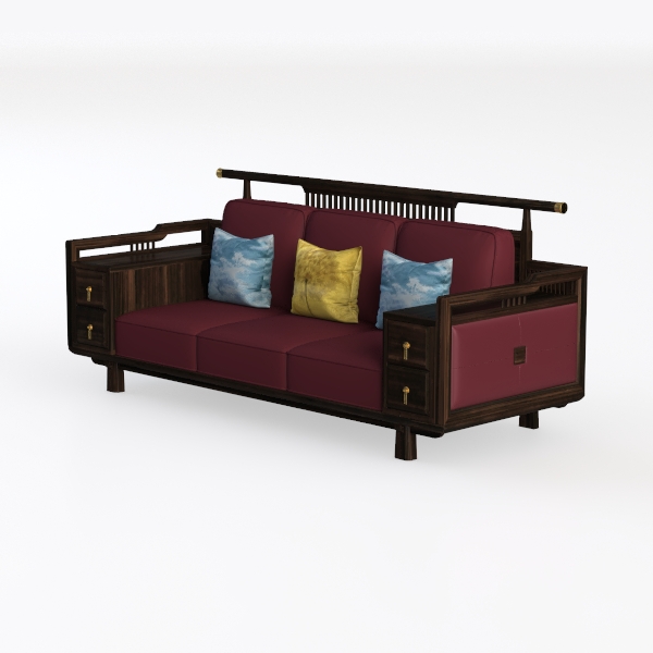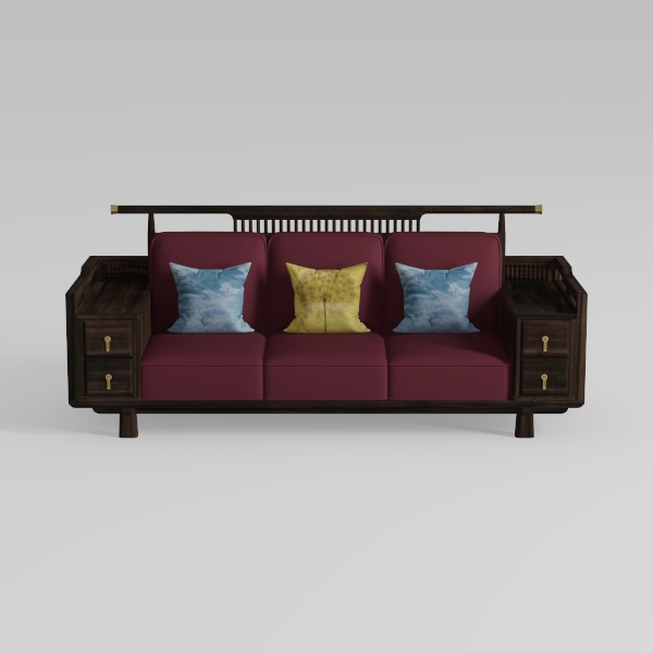 Inspired by the elegance of traditional Asian design, this exquisite sofa showcases a stunning blend of functionality and artistry. The rich, dark wood frame exudes warmth and sophistication, while the vibrant burgundy upholstery adds a splash of bold color, creating a striking visual appeal. The tactile quality of the fabric invites both relaxation and comfort, making it an inviting centerpiece for any living space.