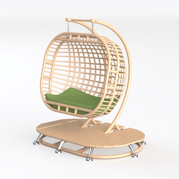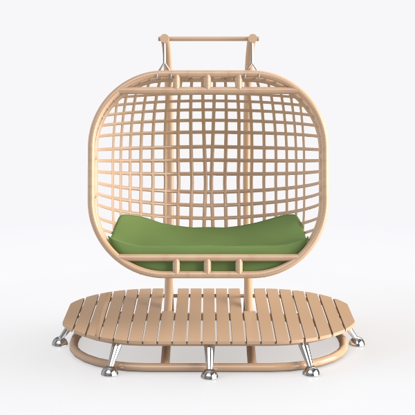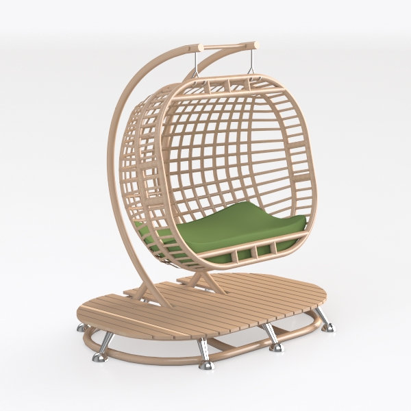 This hanging chair merges organic design with contemporary simplicity, taking cues from natural weaving artistry and the reassuring coziness of classic hammocks. Its gentle curved frame, shaped from light-hued wood, features a grid-like pattern that balances airy openness with steady support, while the soft, moss-green cushion introduces a touch of earthy warmth. The wooden structure feels smooth and slightly cool to the touch, with the grid’s intricate lines adding subtle texture—together, they create a tactile experience that feels both grounded and light.