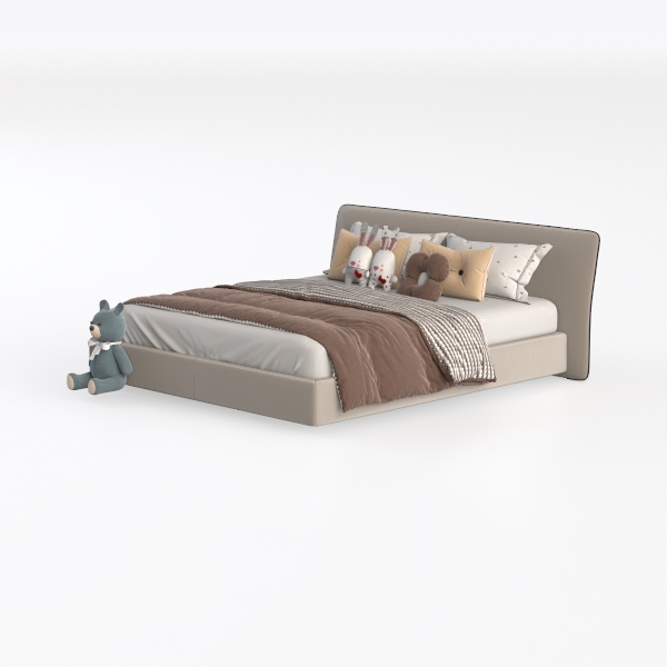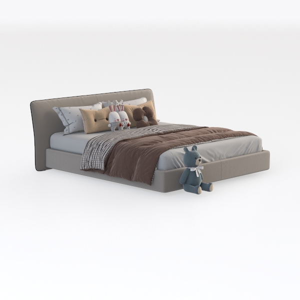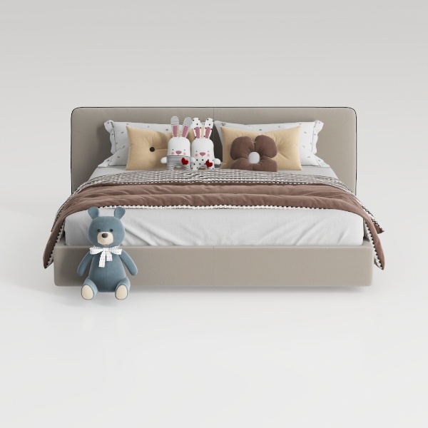 Designed to blend warmth and whimsy, this piece takes inspiration from soft childhood memories, merging gentle, earthy tones with playful elements to create a space that feels both comforting and full of joy. The headboard, crafted from a smooth, light gray upholstery, invites a soft touch, its neutral hue acting as a calm backdrop to the room’s more vibrant accents. The bedspread, layered with textured brown and crisp white fabric, adds depth through subtle pattern, while the pillows—cream-colored with tiny dots, two fuzzy rabbit plushies, and a round, brown floral-shaped cushion—introduce soft, rounded shapes that feel inviting and safe.