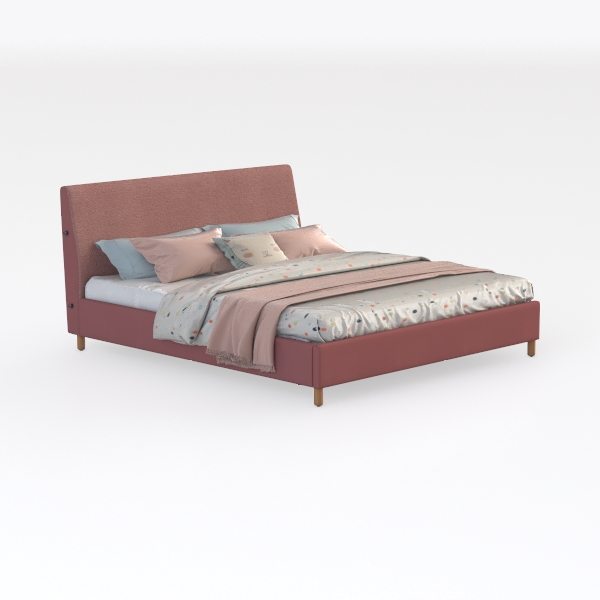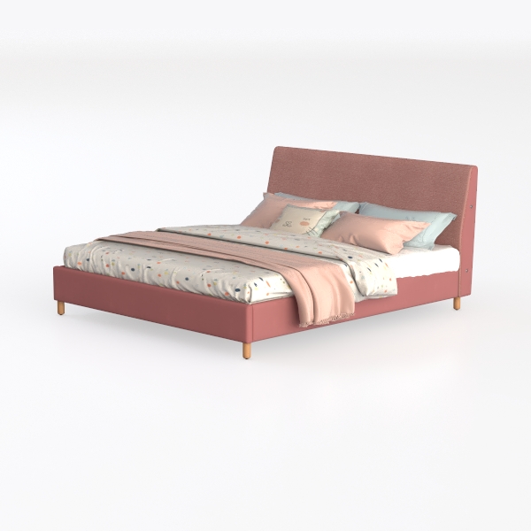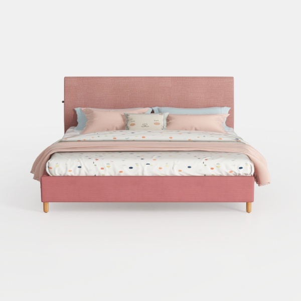 The upholstery of the headboard and frame, in a warm, muted pink, has a subtly textured weave that catches light softly, avoiding harsh glints; it feels surprisingly soft to the touch, like resting against a cloud, while the smooth, rounded edges add to the overall sense of calm. The wooden legs, with their natural grain and light, honeyed hue, ground the piece gently, balancing the softness of the upholstery with a touch of organic sturdiness.