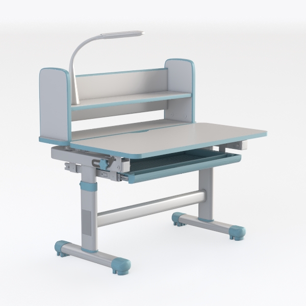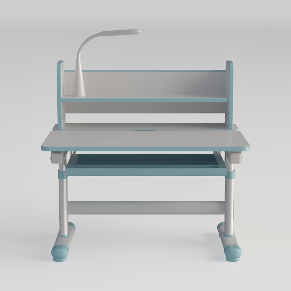 The structure feels both lightweight and robust: the frame, crafted from matte-finished metal, has a cool, smooth touch, while the main tabletop, in soft gray with a subtly textured surface, offers a firm yet gentle feel under hands, ideal for writing or placing laptops. Delicate teal accents along the edges add a soft contrast to the neutral tones, creating a visually calming effect that makes the space feel open and inviting. The integrated, curved desk lamp—with a slender, polished neck—sits neatly on the upper shelf, its warm LED glow casting a gentle light that complements the overall understated vibe.