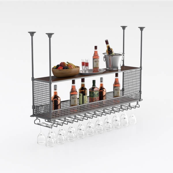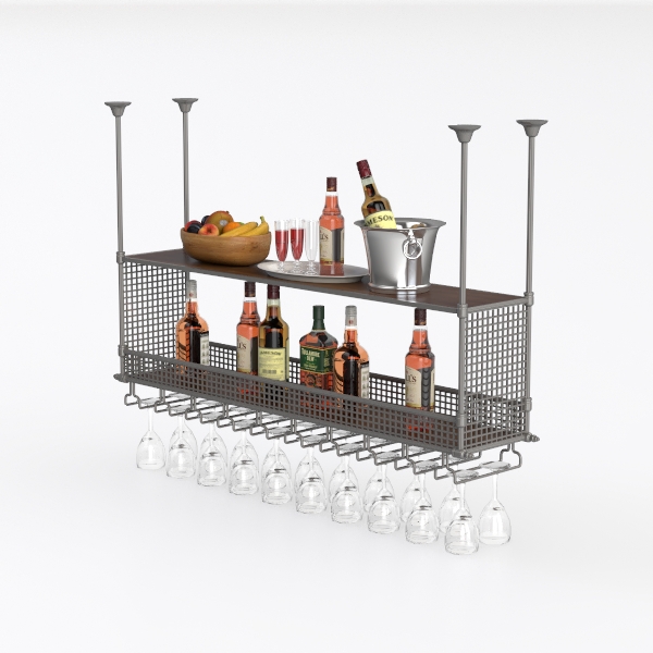 Designed to blend practicality with understated elegance, this piece draws inspiration from the curated ambiance of classic cocktail lounges, where every element serves both function and style. The frame, crafted from matte-finished metal, feels cool to the touch yet smooth, its slender vertical supports creating a lightweight yet sturdy silhouette. The two-tiered design adds visual depth—top shelf holding vibrant fruit and a sleek ice bucket, bottom shelf housing an array of bottles, while the bottom grid securely hangs stemware, keeping glasses within arm’s reach.