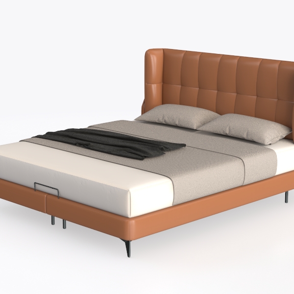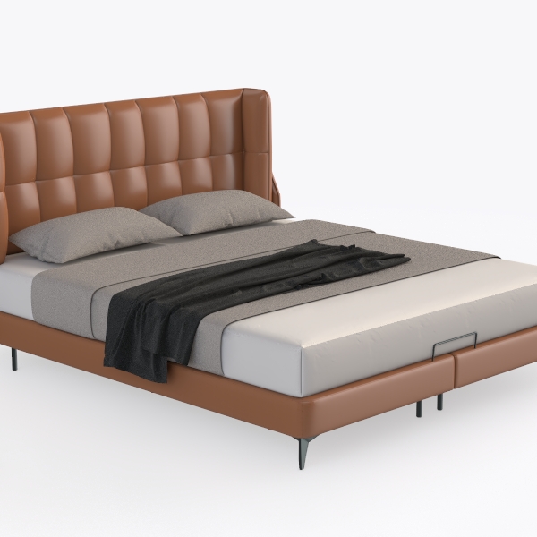 This piece draws inspiration from a harmonious blend of mid-century modern design and contemporary minimalism, where geometric precision meets soft, tactile warmth. The headboard, crafted from a rich terracotta leather, features a subtly textured diamond-quilted pattern that adds depth without overwhelming—each stitched panel curves gently, creating a sense of flow that invites relaxation. The smooth, slightly matte leather surface offers a satisfying touch, while its warm hue infuses the space with a cozy yet sophisticated energy, balancing the sleek black metal legs that ground the frame with a modern edge.