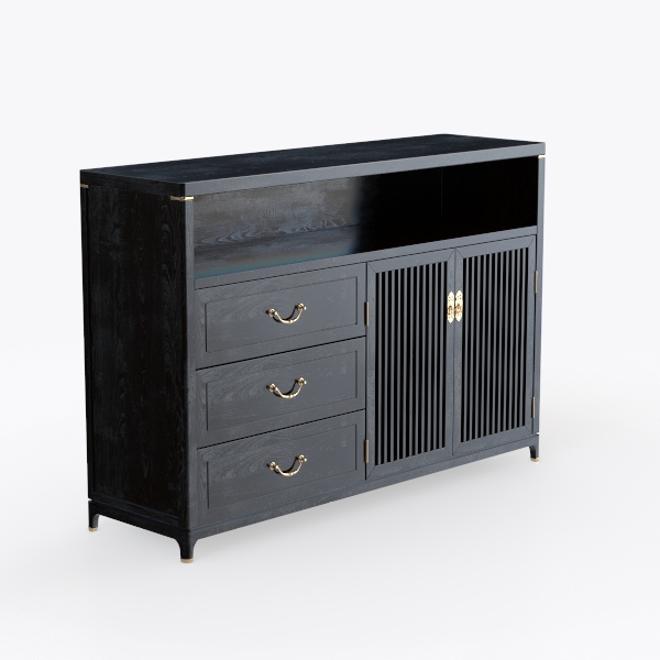 This refined cabinet takes cues from timeless East Asian furniture craftsmanship, merging minimalist modern sensibilities with subtle traditional charm. Crafted from smooth, matte black wood, its surface reveals delicate grain patterns, offering a warm, tactile depth that feels cool to the touch yet inviting. The three deep drawers, adorned with curved brass pulls, glide smoothly to reveal organized storage space for smaller items, while the lattice-fronted cabinet doors provide ventilation and display room for cherished decor.