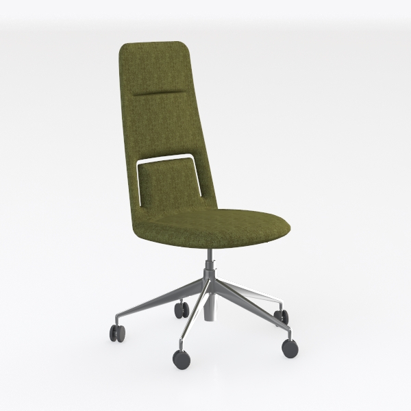 The chair’s most striking feature is its upholstery: a textured olive-green fabric that feels soft yet resilient to the touch, with a subtle weave pattern that catches light gently, avoiding harsh glare. The high, contoured backrest curves to cradle the shoulders and upper back, while the generously sized seat, slightly tilted forward, offers plush support—perfect for long hours of focused work. Complementing this is a sleek, brushed-silver metal frame, its angular legs and central spindle creating a stable, lightweight base that adds a touch of industrial-inspired sophistication without overwhelming the chair’s organic vibe.