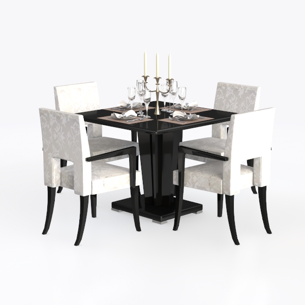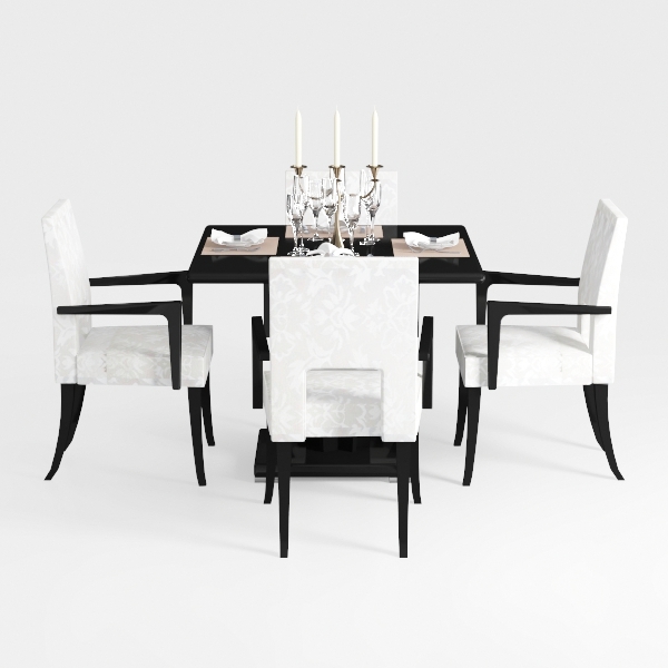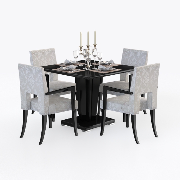 Inspired by the fusion of modern minimalism and classic sophistication, this dining suite marries clean, sharp lines with subtle textural details. The table’s frame, crafted from dark, polished wood, features angular legs that add a bold, architectural presence, while the rectangular tabletop—smooth and slightly reflective—serves as a neutral canvas for gatherings.