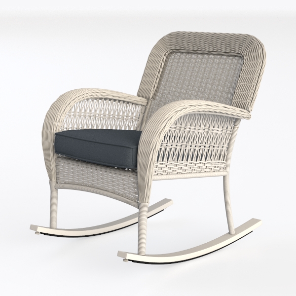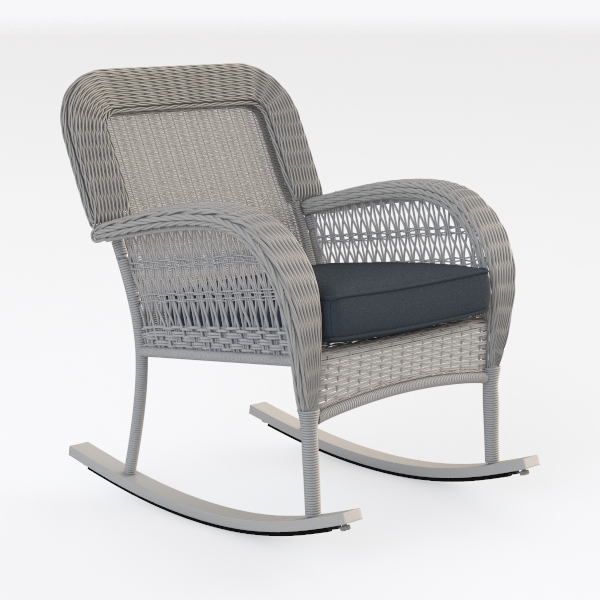This elegant rocking chair draws inspiration from the timeless charm of natural wicker craftsmanship, blending a love for organic materials with a modern focus on comfort. Its frame, meticulously woven from light-hued rattan, features clean, flowing lines that evoke a sense of relaxation and coastal serenity. The texture of the rattan is smooth yet subtly tactile, with each strand carefully interwoven to create a lightweight, airy structure that feels both sturdy and gentle to the touch. The deep blue upholstered cushion, plump and softly padded, adds a pop of color that contrasts beautifully with the chair’s crisp white frame, enhancing its visual appeal with a touch of sophistication.