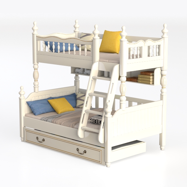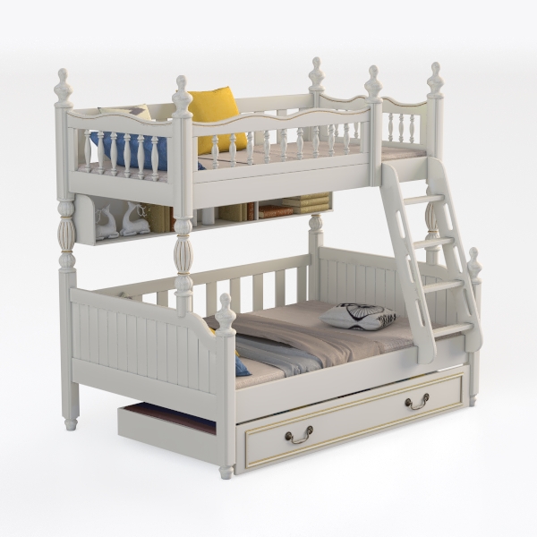 Crafted with timeless charm, this bunk bed blends classic European design sensibilities with modern practicality, born from the need to maximize space while fostering a warm, family-oriented atmosphere. Its soft white finish, smoothed to a silky touch, is complemented by delicate golden accents along the posts and rails, adding subtle elegance without overwhelming the simplicity. The wooden texture, warm and inviting, invites gentle touches, while the light color palette reflects natural light, making the space feel airy and open.