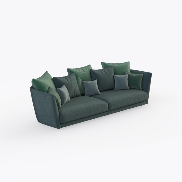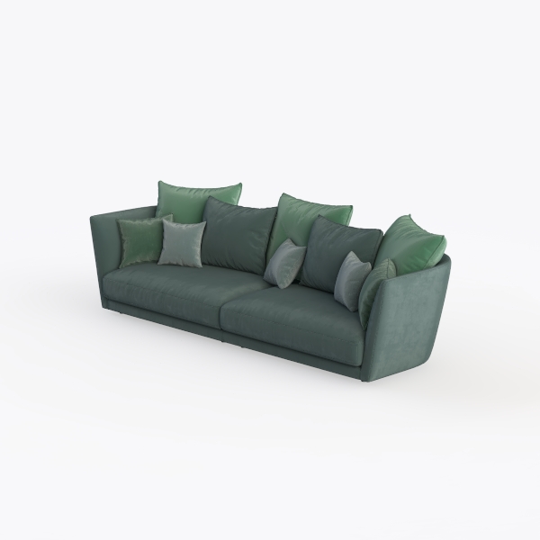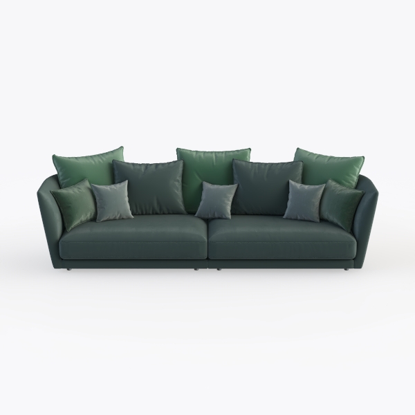 Inspired by the tranquility of nature, this stunning sofa brings a touch of sophistication to any living space. The rich, deep green upholstery, accentuated with plush pillows in varying shades, creates a lush, inviting feel that encourages relaxation and comfort. The smooth, soft texture not only pleases the senses but also promises durability and easy upkeep.